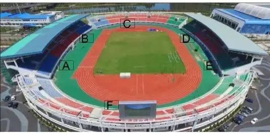 因此,整个音响系统的电子部分布置如下,MIDAS PRO9担任此次开幕式的主调音台,M32为备份调音台一并置于主席台旁边观众席区域上部,功放机柜分六个点分别置于入场口4个角落和跑道两个弧形顶位置。一个体育场,内圈跑道为标准的400米,而防爆沟区域约有700多米,恰恰我们的设备就是分布在这样一个700多米的圈圈上,如下图A、B、C、D、E、F六个位置上。