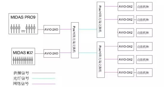 技术难点突破 传统线缆长距离传输会带来高频信号的急剧衰减不说,还容易引入难以解决的各类干扰噪声。有人会说选择调音台的舞台接口箱作为信号的传输系统,这个是个很好的解决方案。 但是对于本次福建省运会项目来说,6个机柜分散布,意味着接口箱也需要6点布置,即使使用MIDAS最小的舞台接口箱传输,那也得要6个舞台接口箱,且主备系统都需要接口箱,总共需要12个接口箱。这样的方案造价昂贵且设备需求量大是最大的缺点。